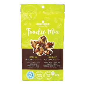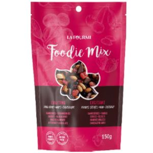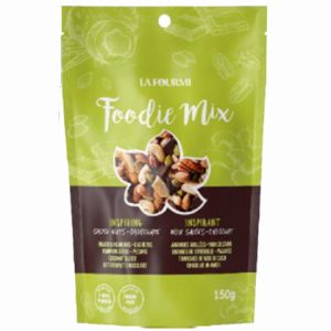 Un encas sucré-salé gourmand composé de morceaux de chocolat mi-amer avec amandes grillées, graines de citrouille, tranches de noix de coco,...