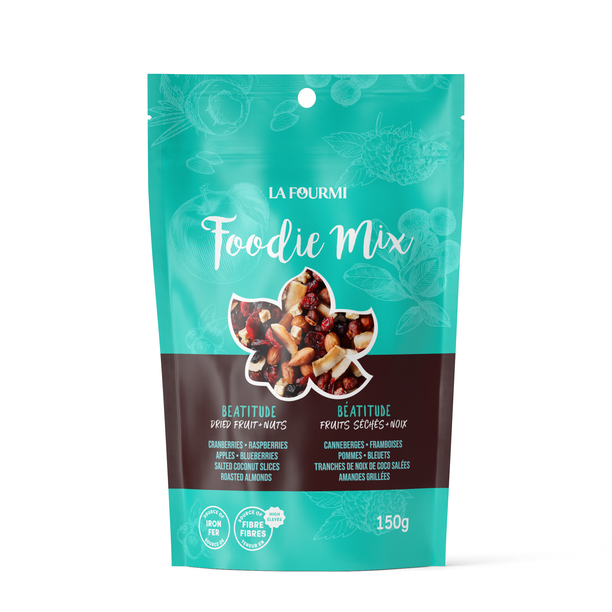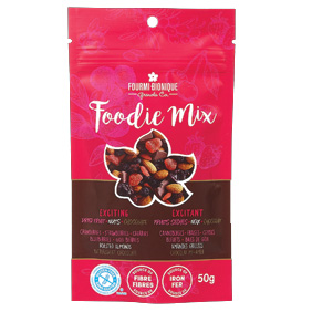 Collation stimulante végane composée de morceaux de chocolat noir mi-amer, d’amandes entières grillées, de fraises, canneberges, cerises, bleuets et de baies...