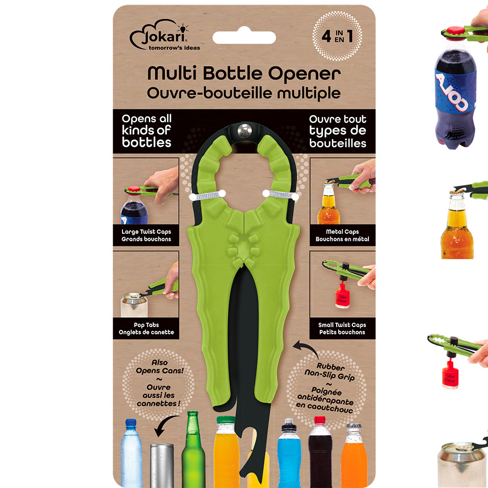 Ouvre-bouteille multiple 4-en-1 pour cannettes, petits ou grands bouchons torsadés et capsules. En paquet de 12 unités