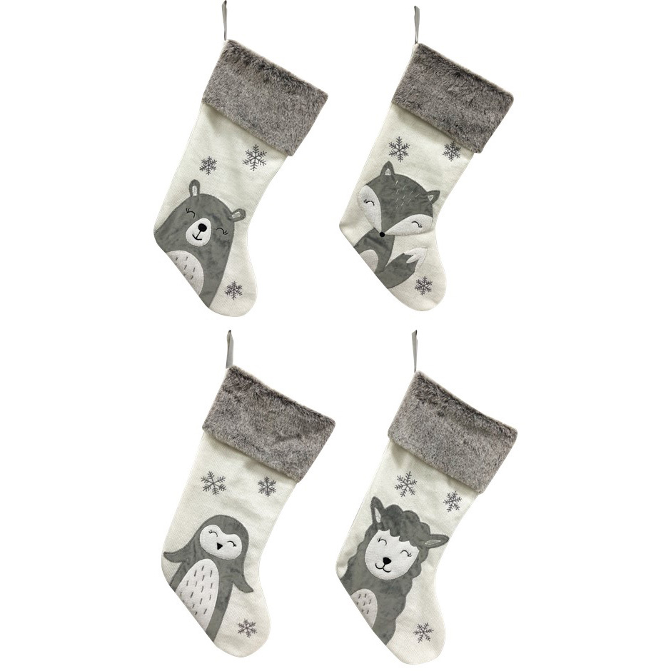 Set of 4 Grey & Beige Christmas Stockings : penguin, bear, fox, sheep