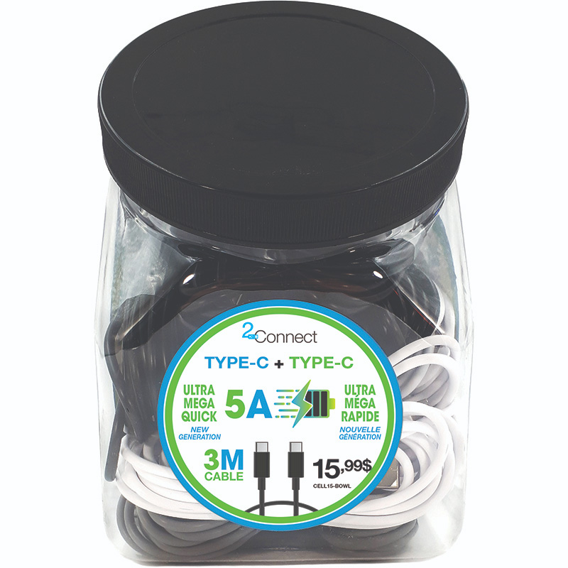 Bol de 24 x câble TYPE-C vers TYPE-C – 3m. 3 couleurs assorties: blanc, noir, gun métal