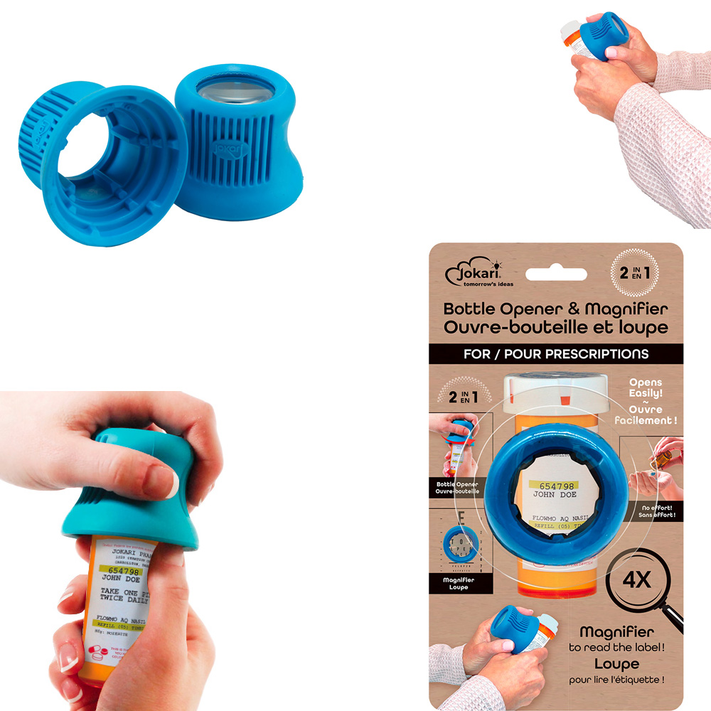 Ouvre-bouteille & loupe pour prescriptions/flacons de médicaments. Poignée antidérapante en caoutchouc. (12 unités)