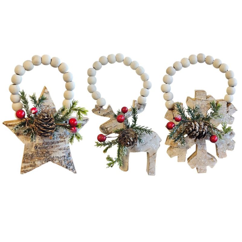 Trio d’ornements en bois : flocon de neige, renne et étoile – 15cm