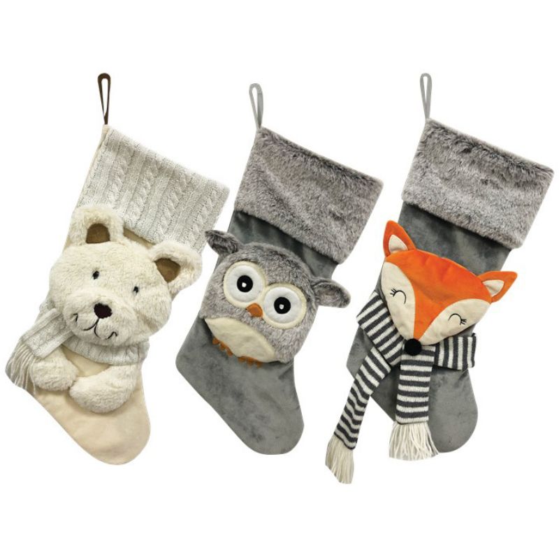 Trio de bas d’animaux en peluche de Noël 3D : ours, hibou, renard