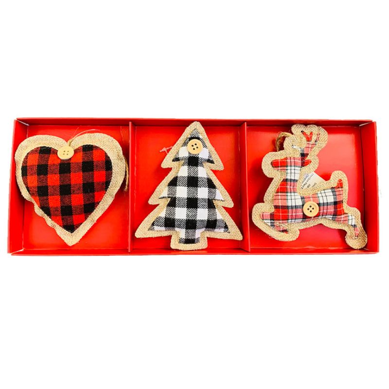 Ornements motifs à carreaux – Ensemble de 3 (Coeur, sapin et renne)
