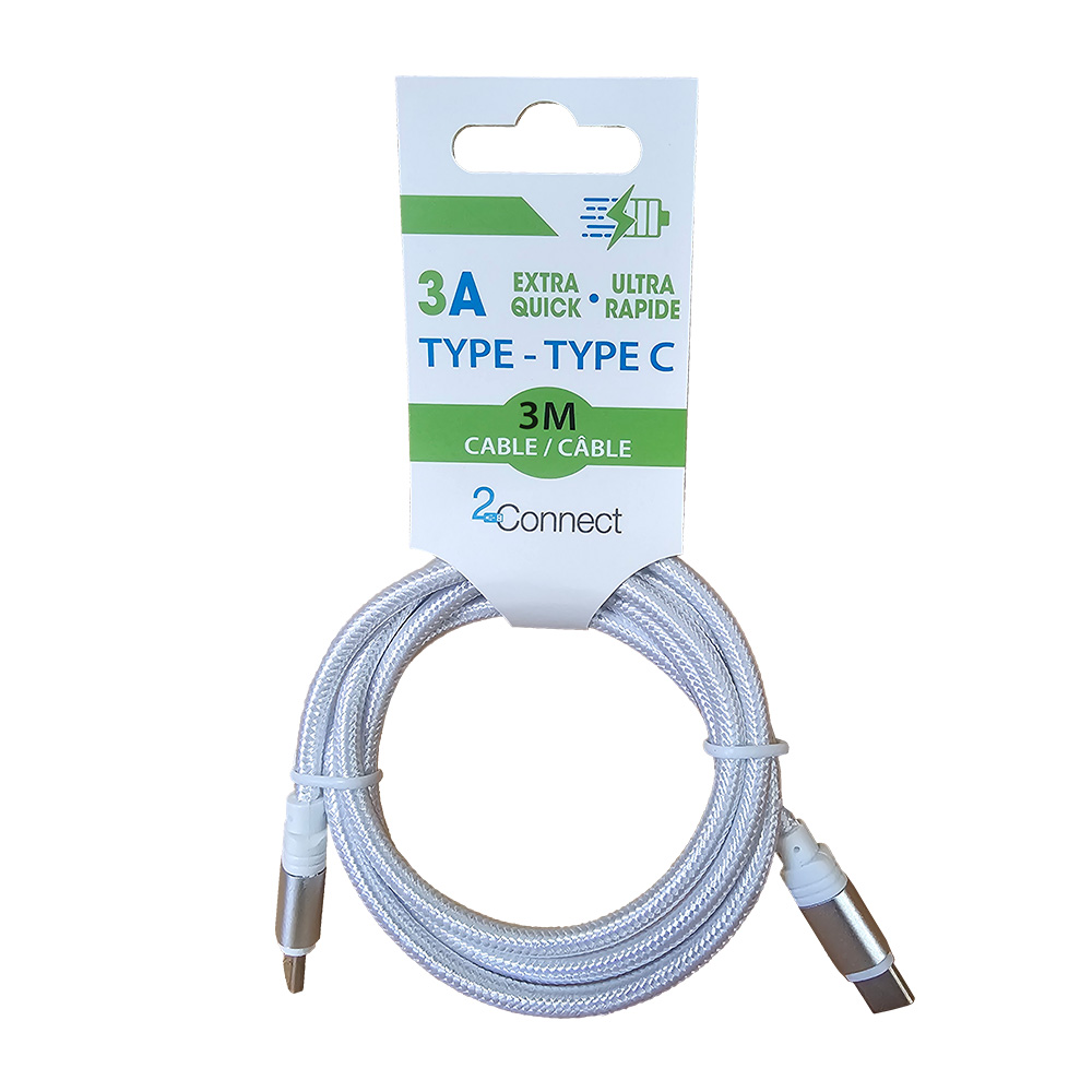 Câble USB-A à Type C, 3m, 2 couleurs assorties : blanc, noir