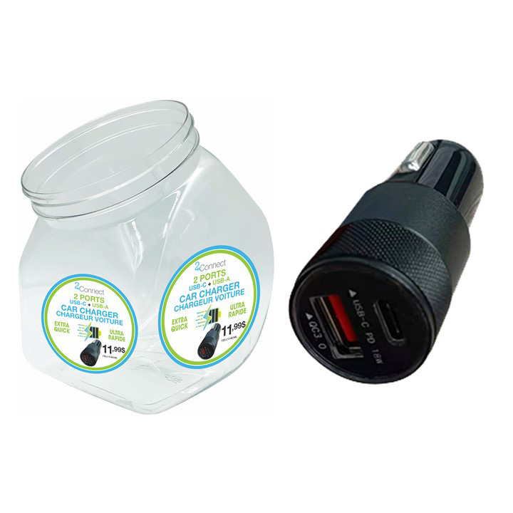 Bol de 24 x chargeurs de voiture, 2 ports : USB-C & USB-A. 3 couleurs assorties: blanc, noir, gun métal