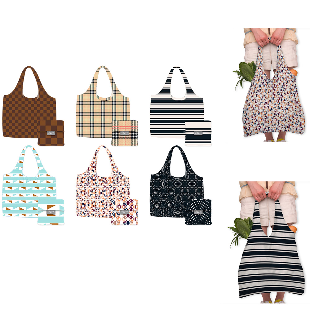 Sacs d’épicerie réutilisables avec pochette, 6 modèles, pliants, léger avec longues poignées. Assortiment de 18 unités.